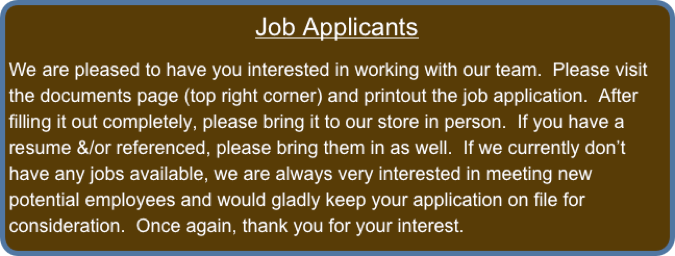 Click here to print our Job Application.  Fill it out and drop it by our store.$2_Program.html